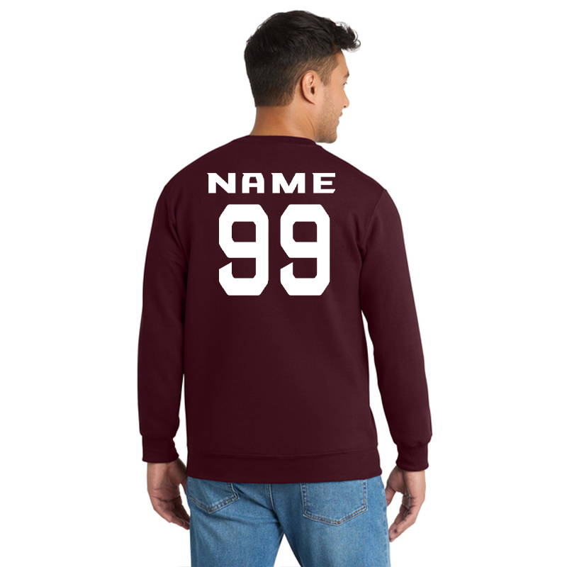 This maroon crewneck is an official Crusaders product designed for players, families, and supporters who want comfort without the bulk of a hood. It uses our core weight 7.8 ounce fleece blend with air jet yarn that gives the fabric a smooth, soft feel. A removable tag adds extra comfort for everyday wear. The front displays the full Crusaders team logo, and the back can be personalized with the player’s name and number in team colors.